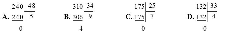 Phép chia nào dưới đây có số dư bằng 4?