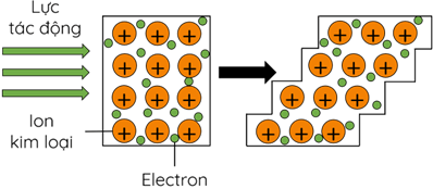 Hình vẽ trên mô tả tính dẻo của kim loại: Khi tác dụng lực, cáp lớp tinh thể kim loại bị trượt lên nhau làm kim loại bị biến dạng nhưng không tách rời nhau nhờ lực hút tĩnh điện giữa cation kim loại và electron tự do