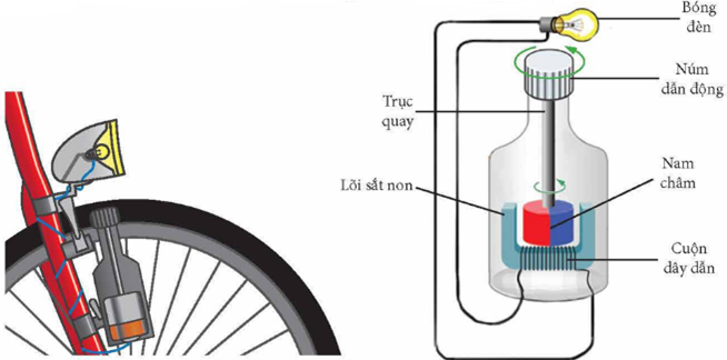 Hình bên mô tả một dynamo gắn trên xe đạp và sơ đồ cấu tạo của nó. Khi xe đạp chạy, bánh xe làm cho núm dẫn động quay, kéo theo nam châm quay. Khi đó trong cuộn dây xuất hiện dòng điện, làm cho bóng đèn mắc nối tiếp với cuộn dây sáng lên.