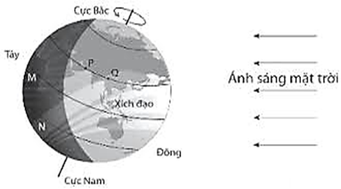 a. Vị trí đang là ban ngày là: P, Q vì hai vị trí này đang được Mặt Trời chiếu sáng.