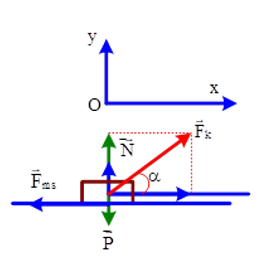 Chiếu lên trục Ox: \(F.c{\rm{os}}\alpha - {F_{ms}} = ma\) (1)