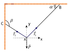 - Vật nằm cân bằng nên: \({\vec T_1} + {\vec T_2} + \vec P = \vec 0\left( 1 \right)\)