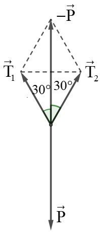 Theo hình vẽ ta có: \({\vec T_1} + {\vec T_2} + \vec P = \vec 0 \Leftrightarrow {\vec T_1} + {\vec T_2} = - \vec P\)