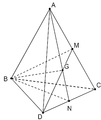 Gọi \[G = AN \cap DM\]. Xét tam giác \[ACD\], có: \[AN,DM\] là các đường trung tuyến của tam giác. Mà \[G = AN \cap DM\] nên \[G\] là trọng tâm tam giác \[ACD\]. Ta có: \[\left\{ \begin{array}{l}BG \subset \left( {MBD} \right)\\BG \subset \left( {ABN} \right)\end{array} \right.\] \[ \Rightarrow \left( {MBD} \right) \cap \left( {ABN} \right) = BG.\] |