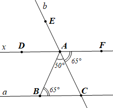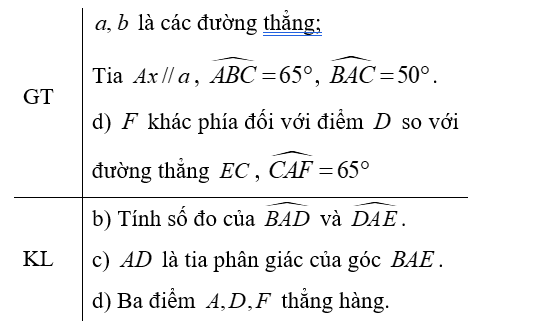 b) Do \[Ax\,{\rm{//}}\,a\] nên \(\widehat {BAD} = \widehat {ABC} = 65^\circ \) (hai góc so le trong).