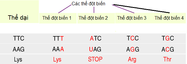 | Loại đột biến | Thay thế một cặp A-T bằng một cặp T-A | Mất một cặp A-T | Thay thế một cặp C-G bằng một cặp G-C | Thêm một cặp G-C |