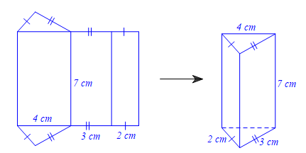 Sau khi gấp và ghép các đường được đánh dấu bằng nhau lại ta được hình lăng trụ có đáy là tam giác với độ dài ba cạnh là \[2\,\,{\rm{cm}},3\,\,{\rm{cm}},4\,\,{\rm{cm}}\] và chiều cao là \(7\,\,{\rm{cm}}\).