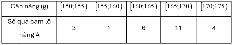 Kết quả khảo sát cân nặng của 25 quả cam ở lô hàng A được cho ở bảng sau: