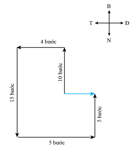 (1 điểm). Em của An chơi trò chơi tìm kho báu ở ngoài vườn với các bạn của mình. Em của An giấu kho báu của mình là một chiếc vòng nhựa vào trong một chiếc giày rồi viết mật thư tìm kho báu như sau: Bắt đầu từ gốc cây ổi, đi 10 bước về phía Bắc, sau đó 4 bước về phía Tây, 15 bước về phía Nam, 5 bước về phía Đông và 5 bước về phía Bắc là tới chỗ giấu kho báu.