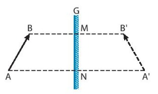 Vận dụng tính chất ảnh đối xứng với vật qua gương thì khoảng cách từ các điểm trên vật tới gương bằng khoảng cách từ các ảnh của điểm trên vật tới gương. Do đó, vị trí gương phẳng G thỏa mãn: MB = MB’ và NA = NA’.