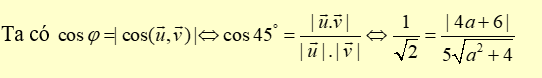 \( \Leftrightarrow 5\sqrt {{a^2} + 4} = \sqrt 2 |4a + 6| \Leftrightarrow 25{a^2} + 100 = 32{a^2} + 96a + 72\)