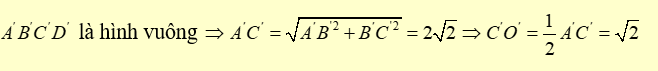 \(\Delta C{C^\prime }H\) vuông tại \(H \Rightarrow {C^\prime }H = \sqrt {C{C^{\prime 2}} - C{H^2}} = \frac{{3\sqrt 2 }}{2} \Rightarrow O{O^\prime } = {C^\prime }H = \frac{{3\sqrt 2 }}{2}\)