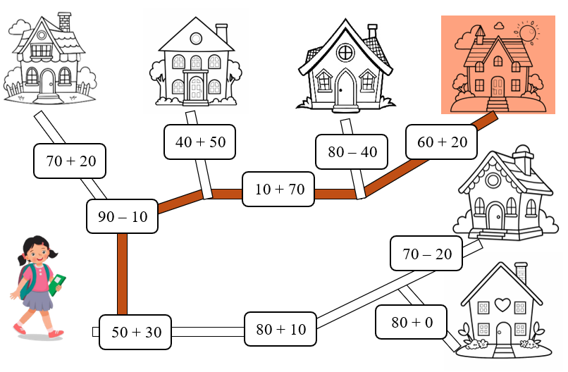 Hãy giúp Lan về nhà trên con đường đi qua các phép tính có kết quả bằng 80 bằng cách tô màu vào con đường và ngôi nhà đó.