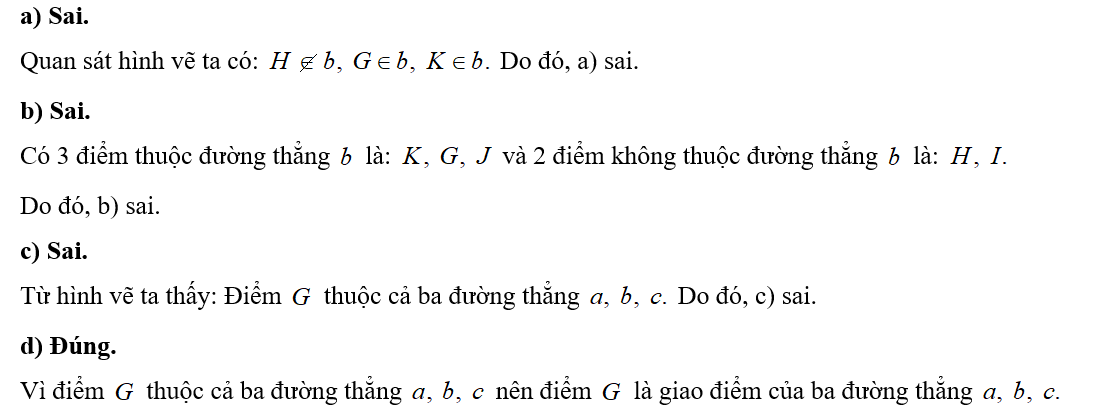 Vì \(G\) không là điểm chung của ba đường thẳng \(a,\;\,b\) và \(c\) nên điểm \(G\) không là giao điểm của ba đường thẳng \(a,\;\,b\) và \(c.\)
