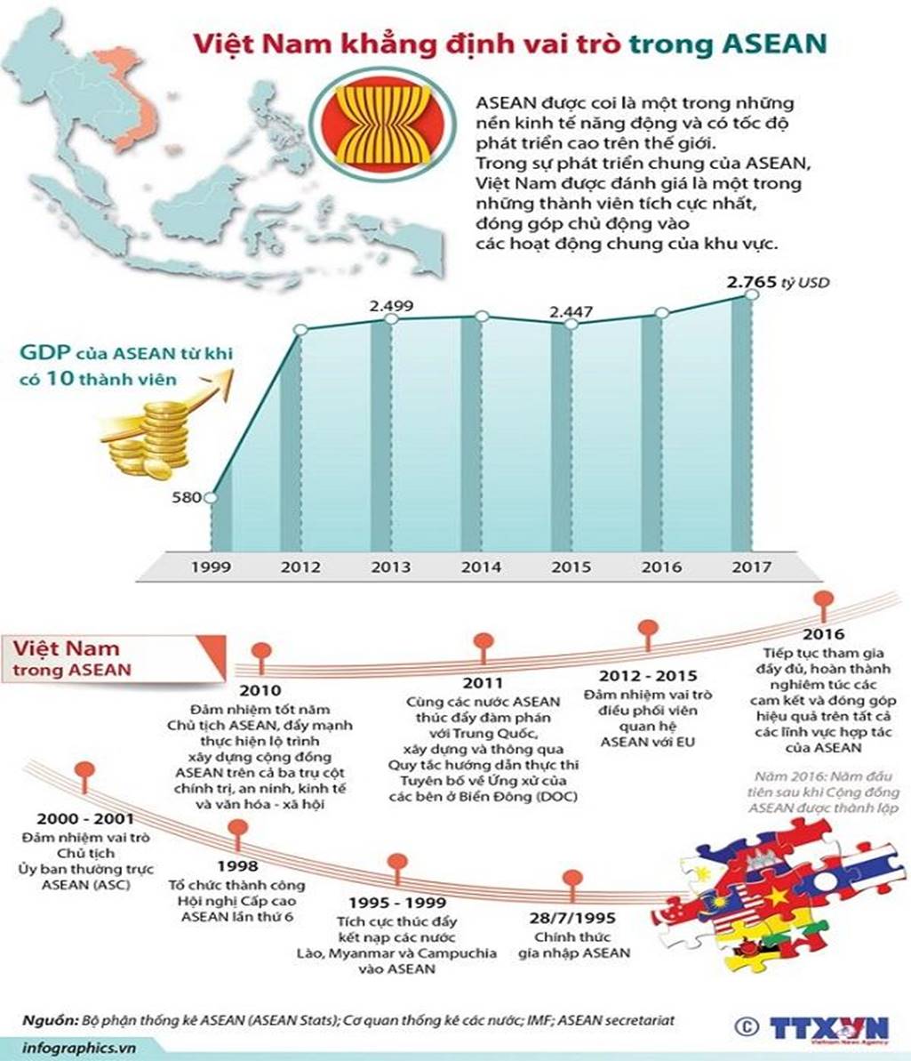 - Dưới đây là một số ví dụ tham khảo: 1) Có nhiều sáng kiến thúc đẩy hợp tác kinh tế thương mại của tổ chức…; 2) Cùng ASEAN tiến tới xây dựng cộng đồng phát triển bền vững, thịnh vượng; 3) Cùng ASEAN đấu tranh duy trì an ninh, chính trị ổn định của khu vực; 4) Đảm nhiệm tốt vai trò chủ tịch ASEAN; 5) Tổ chức thành công nhiều hội nghị cấp cao ASEAN; 6) Việt Nam là thành viên tích cực thúc đẩy sự hợp tác của ASEAN với các tổ chức khu vực khác … |