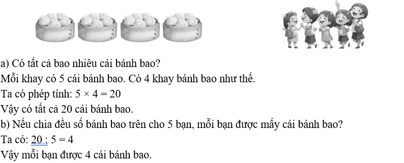 (b) Nếu chia đều số bánh bao trên cho 5 bạn, mỗi bạn được mấy cái bánh bao?