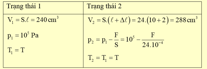 \( \to {10^5}.240 = \left( {{{10}^5} - \frac{F}{{{{24.10}^{ - 4}}}}} \right).288 \to F = 40\;{\rm{N}}.\)