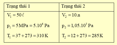 \(\frac{{{p_1}{V_1}}}{{{T_1}}} = \frac{{{p_2}{V_2}}}{{{T_2}}} \to \frac{{{{5.10}^6}.50}}{{310}} = \frac{{1,{{05.10}^5}.10.n}}{{285}} \to n = 218\).