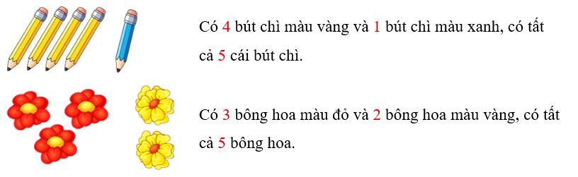 (c) Có 4 quả xoài và 1 quả dưa hấu, có tất cả 5 quả