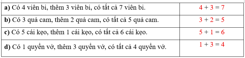 Có 2 quả xoài, thêm 3 quả xoài, có tất cả 5 quả xoài.