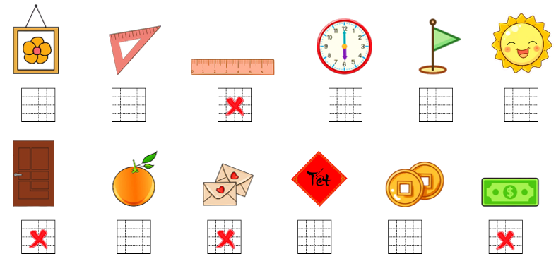 vào ô trống dưới các đồ vật hình chữ nhật.