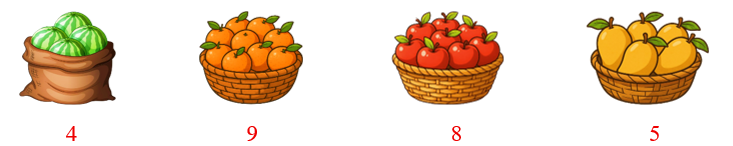 Vậy: Sắp xếp số lượng quả theo thứ tự từ bé đến lớn là: 4; 5; 8; 9