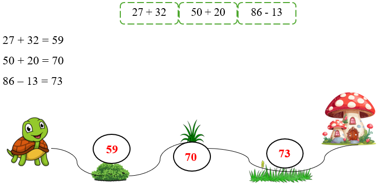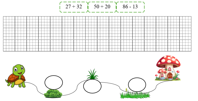 Em hãy giúp bạn rùa về nhà bằng cách thực hiện các phép tính dưới đây và điền kết quả vào chỗ trống theo thứ tự từ bé đến lớn.