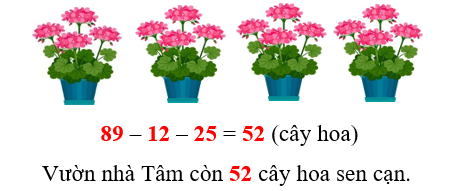 Vườn nhà Tâm có 89 cây hoa sen cạn. Hôm qua mẹ bán 12 cây hoa sen cạn. Hôm nay mẹ bán 25 cây nữa. Hỏi vườn nhà Tâm còn bao nhiêu cây hoa sen cạn?
