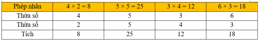 b) Các thừa số là 5 và 8, tích là 40: 5 × 8 = 40
