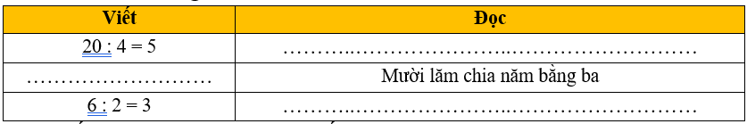 Phép chia 8 : 2 = 4 được đọc là: Tám chia hai bằng bốn