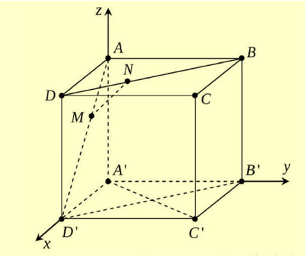 Chọn hệ trục tọa độ \(Oxyz\) sao cho \(O \equiv A',A'D' \equiv Ox,A'B' \equiv Oy,A'A \equiv Oz\).