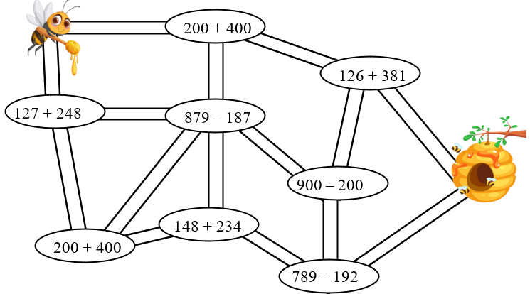 Em hãy giúp bạn ong về nhà bằng cách tô màu vào các con đường đi qua phép tính có kết quả lớn hơn 500