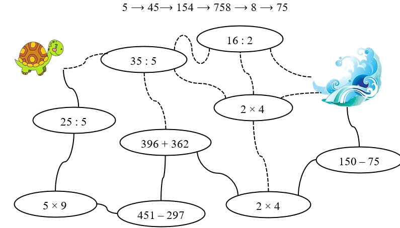 Em hãy nối liền các con đường mà chú rùa đã đi qua để tìm đường ra biển cho chú rùa nhé. Biết chú rùa bò qua các phép tính có kết quả theo thứ như sau: