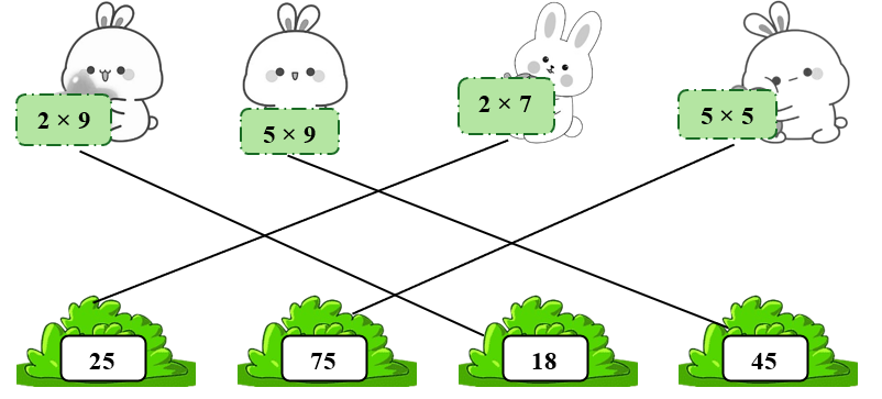 Đã đến giờ ăn của thỏ con. Em hãy giúp các chú thỏ ăn được đúng cỏ của mình bằng cách nối phép tính với kết quả đúng nhé!