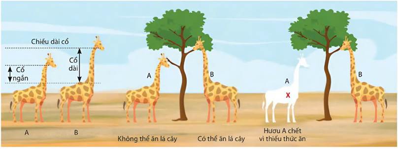 b. Khi chiều cao của cây tăng dần, những biến dị cổ dài là biến dị có lợi, sống sót và sinh sản mạnh hơn và ngày càng tăng số lượng.