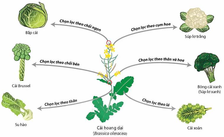 c. Kết quả của chọn lọc nhân tạo là hình thành các giống cây trồng mang các đặc điểm khác nhau từ một vài dạng tổ tiên hoang dại ban đầu.