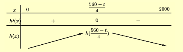 Ta có: \(h'\left( x \right) = - 4x + 560 - t = 0 \Rightarrow x = \frac{{560 - t}}{4} \in \left( {0;2000} \right)\)