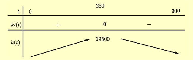 Khi đó số tiền thuế thu được từ doanh nghiệp là \(k\left( t \right) = \frac{{560 - t}}{4}t = \frac{{ - {t^2}}}{4} + \frac{{560}}{4}\), với \(0 < t < 300\)