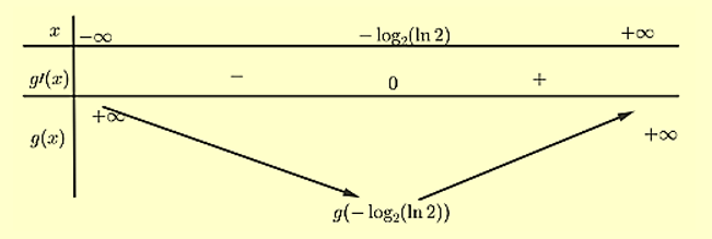 Xét hàm số \(g\left( x \right) = {2^x} - x \Rightarrow g'\left( x \right) = {2^x}{\rm{ln}}2 - 1 = 0 \Leftrightarrow x = - {\rm{lo}}{{\rm{g}}_2}\left( {{\rm{ln}}2} \right)\)