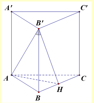 Gọi \(H\) là hình chiếu của \(A\) trên \(BC\). Khi đó \(AH = \frac{{a\sqrt 3 }}{2}\) và \(AH \bot \left( {BCC'B'} \right)\) nên góc giữa \(AB'\) và ( \(BCC'B\)) là \(\widehat {AB'H} = {30^ \circ }\).