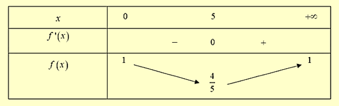 Dựa vào bảng biến thiên, ta có giá trị nhỏ nhất của hàm số \(f\left( x \right)\) trên \(\left( {0; + \infty } \right)\) là \(\frac{4}{5}\).