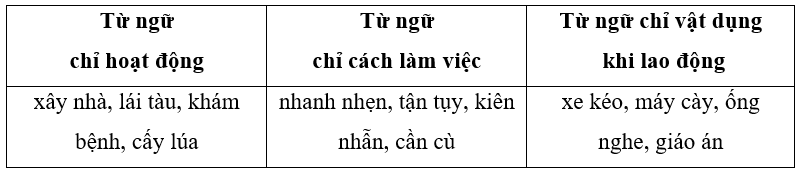 Cần cù, xây nhà, xe kéo, máy cày, lái tàu, nhanh nhẹn, tận tụy, ống nghe, khám bệnh, giáo án, kiên nhẫn, cấy lúa.