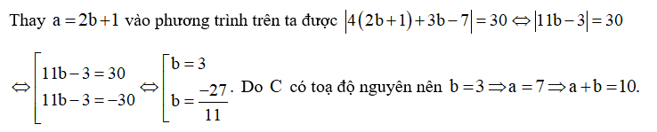 Trong mặt phẳng tọa độ Oxy, cho hai điểm A(1;1), B(4; -3). Gọi C(a,b) thuộc đường thẳng (d): x-2y -1 = 0 sao cho khoảng cách từ C đến đường thẳng AB bằng 6 . Biết rằng C có hoành độ nguyên, giá trị của a+b bằng bao nhiêu (nhập đáp án vào ô trống)?