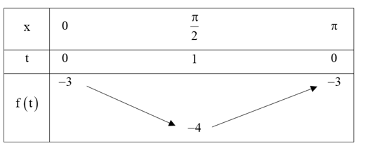 Căn cứ vào bảng biến thiên, ta thấy phương trình \[f\left( {\sin x} \right) = m\] có đúng hai nghiệm trên đoạn \[\left[ {0\,;\,\,\pi } \right]\] khi và chỉ khi \( - 4 < m \le - 3\), tức là \(m \in \left( { - 4; - 3} \right]\). Khi đó, \(a = - 4;b = - 3\).