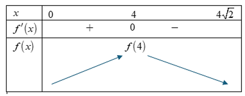 Có \(f'\left( x \right) = 0 \Leftrightarrow 32 - {x^2} = {x^2} \Rightarrow x = 4\). Bảng biến thiên của hàm số \(f\left( x \right)\) trên khoảng \(\left( {0;4\sqrt 2 } \right)\):