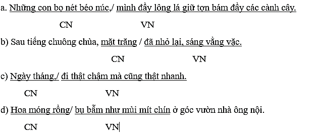 Em hãy gạch chân rồi điền chủ ngữ “CN” và vị ngữ “VN” dưới bộ phận được gạch chân đó: