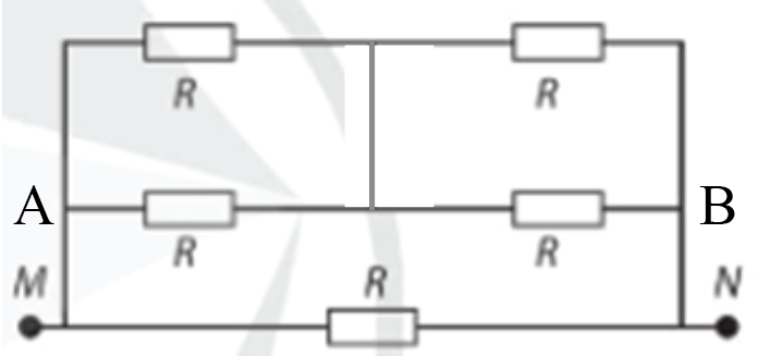 Cho mạch điện như hình vẽ, các điện trở R đều bằng nhau. Điện trở tương đương giữa M và N là