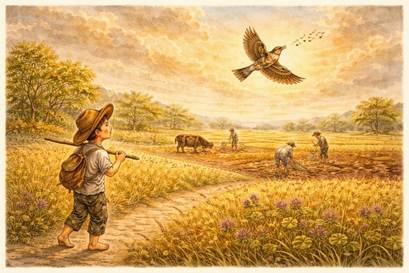 Theo với tiếng chim bay lên, từ không trung vọng xuống một tiếng hót trong sáng diệu kì, giọng ríu ran đồ hồi, âm điệu hài hòa đến tinh tế. Giọng hót vừa đượm vẻ hồn nhiên, vừa thơ thới, thanh thảnh... Chim gieo niềm yêu đời vô tư cho những người lam lũ trên mặt đất. Lúc ấy, trên cánh đồng, vẫn người nào việc ấy. Người làm cỏ vẫn làm cỏ, người xới xáo vẫn xới xáo, người cày cuốc vẫn cày cuốc... Nhưng tiếng chim hồn hậu đang nhập lặng lẽ vào tâm hồn họ.