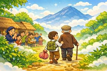 Ông cháu tôi lên đường trong tiếng dặn dò tíu tít của lũ làng: