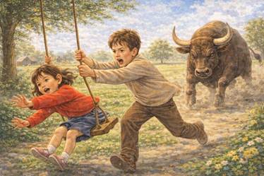 Bắt lấy dây đu, cậu giật đu đứng lại và hất em mình sang bên, vừa kịp lúc con trâu lao đến. Cô bé khiếp hãi, la lên một tiếng. Con trâu quay mòng mòng, móng liên tục cào cào đất, chuẩn bị húc tiếp.